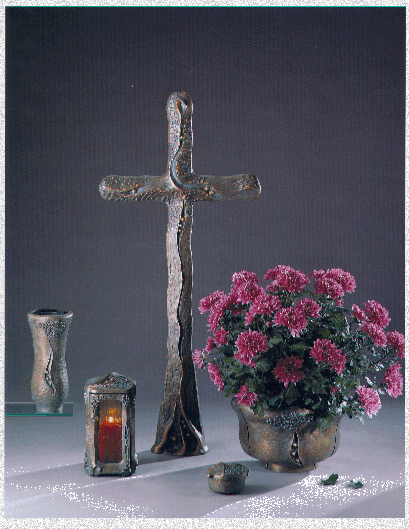 Sakralprogramm. Skulpturen, Ornamente, Beschriftungen, Vasen, Blumenschalen und Laternen in unterschiedlichen Stilrichtungen. |